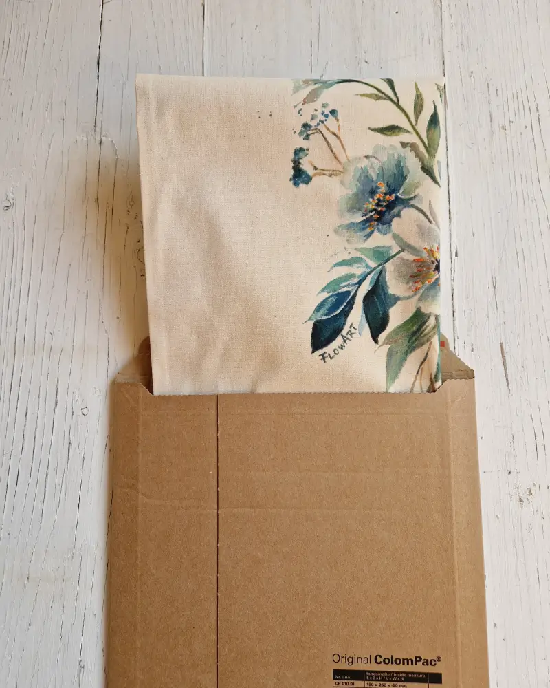 Modelul este pictat direct pe pânza din bumbac natur, fiecare detaliu fiind aplicat manual, cu grijă și atenție la lumină și vibrație cromatică. Rezultatul este o piesă specială, care combină utilul cu esteticul și transformă un obiect simplu într-un accesoriu artistic.