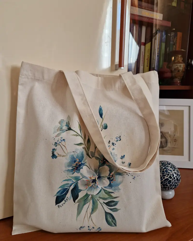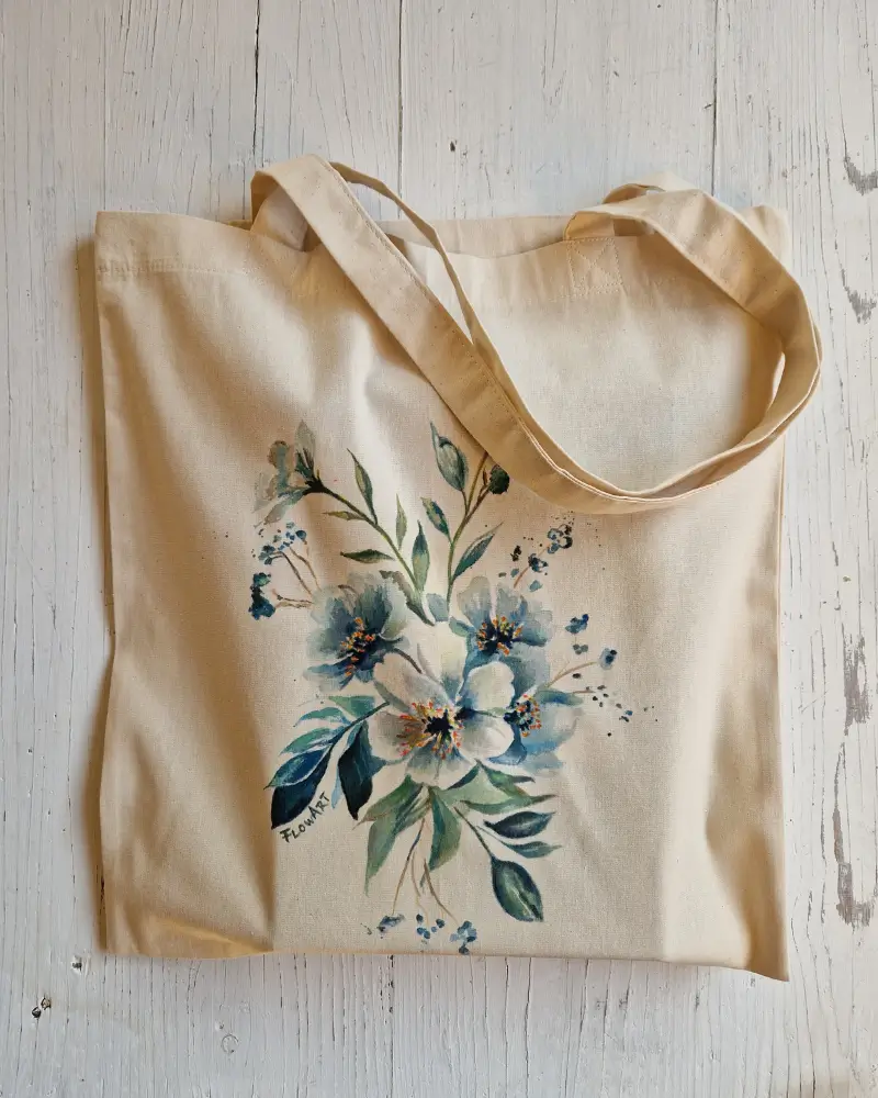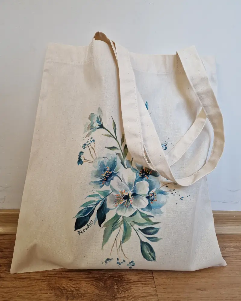 Această geantă pictată manual cu flori albastre aduce un aer proaspăt și elegant oricărei zile. Florile, realizate în tușe fluide și nuanțe de albastru, creează o compoziție armonioasă, ușor de asortat atât cu ținutele casual, cât și cu cele feminine.