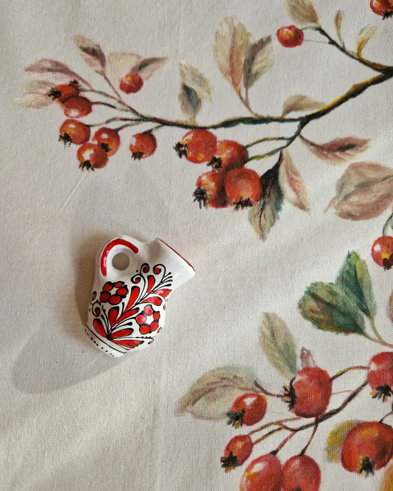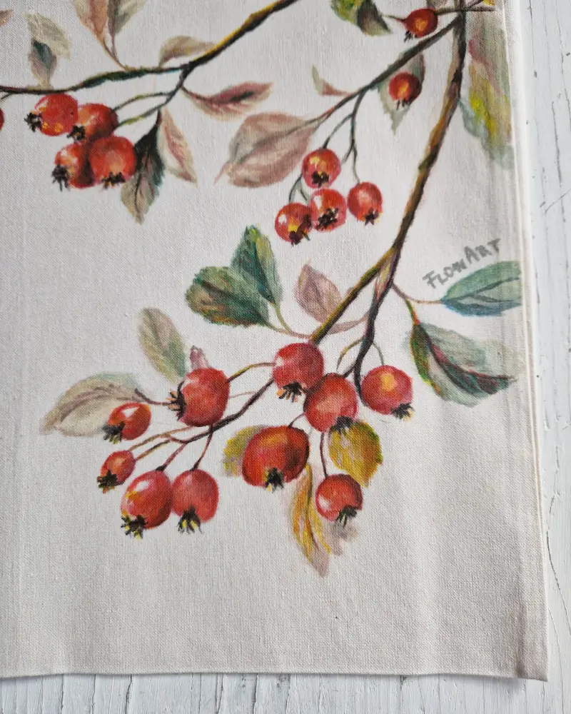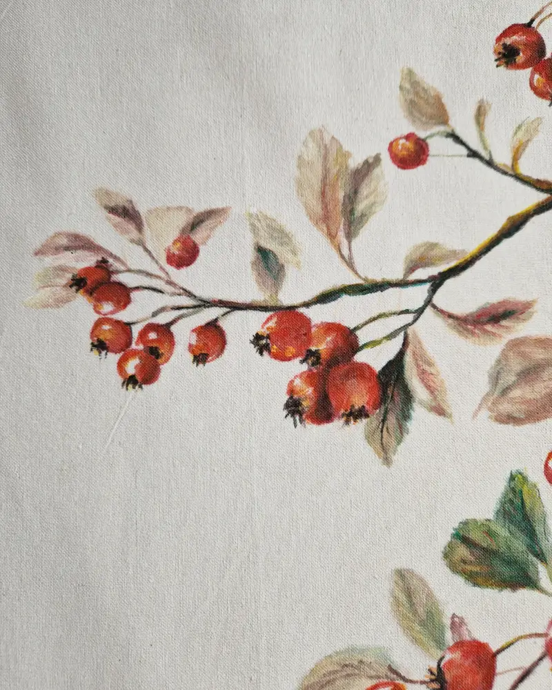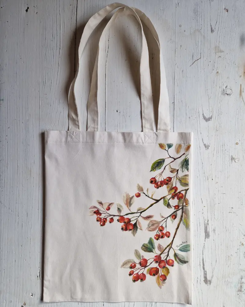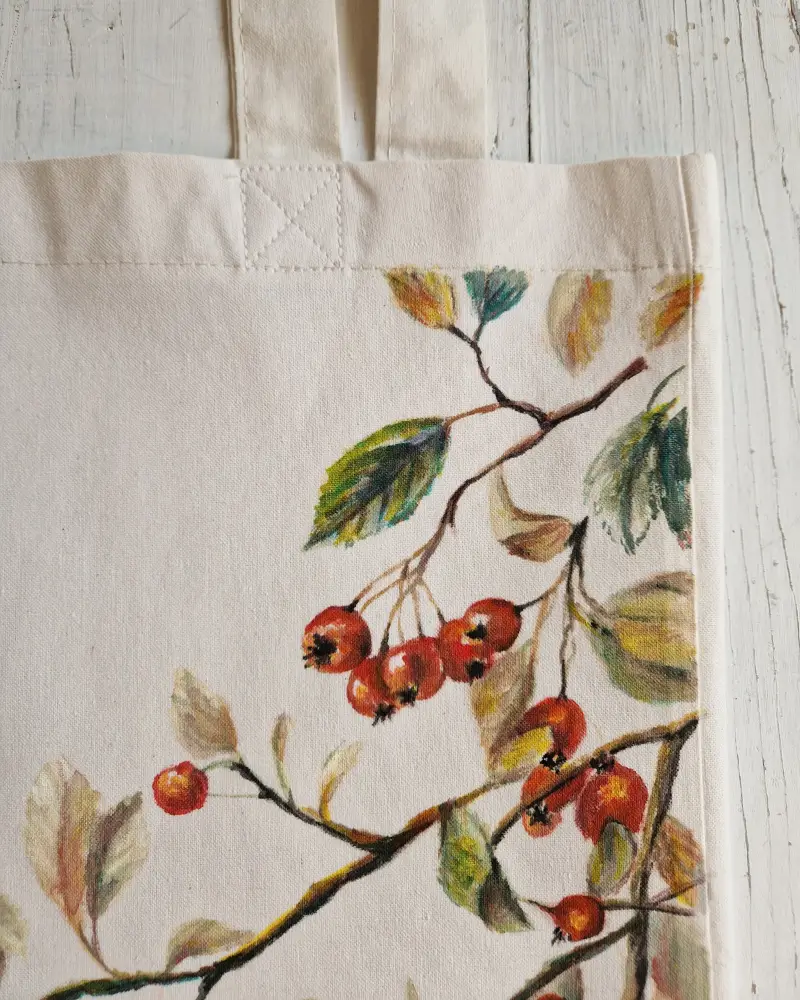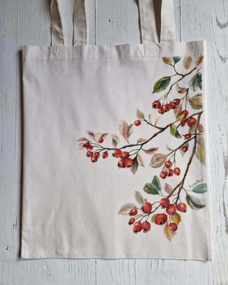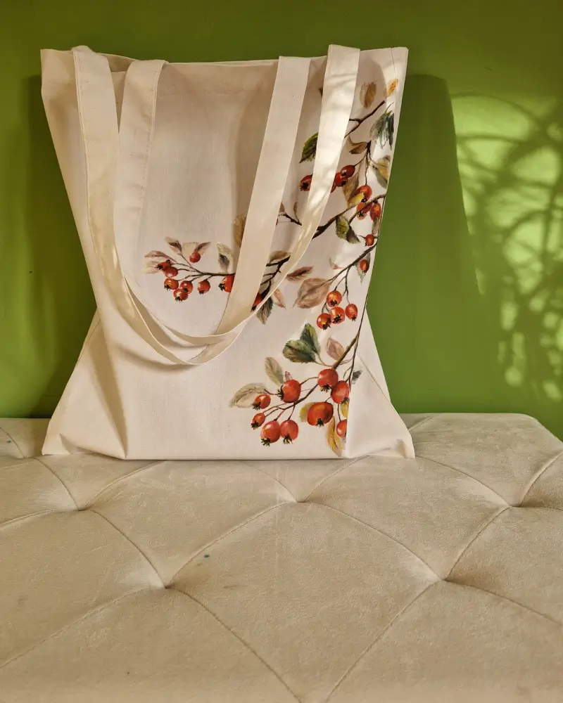 Această geantă pictată manual surprinde delicatețea măceșelor – simbol al vitalității și al frumuseții autentice. Realizată pe pânză de bumbac natural, este rezistentă, plăcută la atingere și potrivită pentru uz zilnic. Designul original Flow Art transformă un accesoriu simplu într-o piesă artistică, creată pentru cei care apreciază naturalețea și detaliul manual.