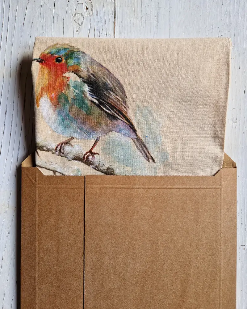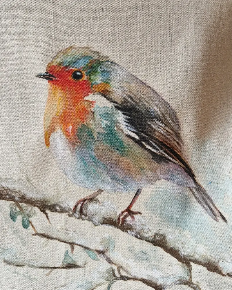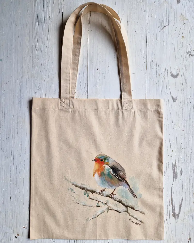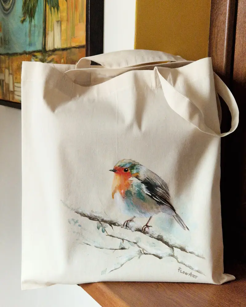 Această geantă pictată manual surprinde un măcăleandru – o pasăre cântătoare cunoscută pentru prezența sa calmă și cântecul discret. Compoziția este aerată, cu tușe fine și culori blânde, creând o senzație de liniște și introspecție.